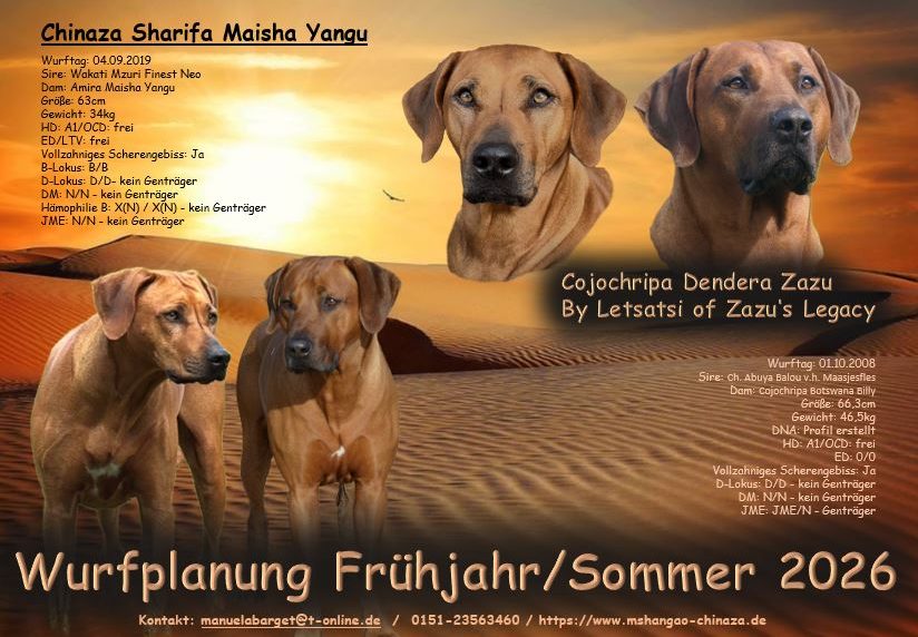 Wir erhoffen uns aus dieser Verbindung wesensfeste, charakterstarke Welpen, die sowohl durch ihr ausgeglichenes Temperament als auch durch eine natürliche Bindungsbereitschaft überzeugen – ideale Familienhunde mit typischem Ridgeback-Charme.